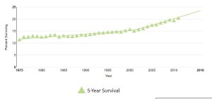 This chart from the NCI’s SEER database shows the five-year survival for lung cancer. Note the awesome upward trend. Survival increased to 19.4% in 2015.