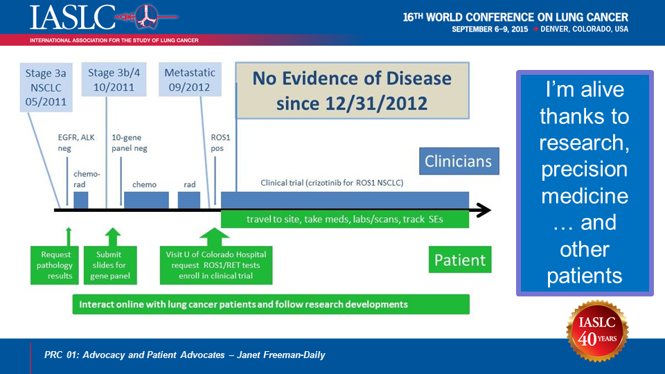 As the slide says, I’m alive thanks to research, precision medicine, and other patients. My lung cancer journey is a good example of the importance of research, hope, and engaged patients and advocates.