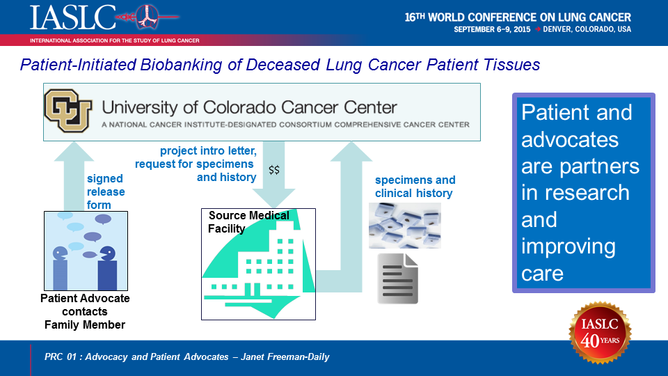 Engaged patients and advocates are working with clinicians and researchers to accelerate research and improve patient outcomes. Last year advocates were instrumental in obtaining Medicare coverage for lung cancer screening, and a group of lung cancer survivors helped change National Comprehensive Cancer Network guidelines for treatment of metastatic lung cancer. Patients and advocates are supporting the “Don’t Guess. Test.” campaign to encourage more patients to get genomic testing. At this conference, patients and advocates will be discussing their involvement in the NCI’s Lung-MAP precision medicine trial, establishment of support groups, a clinical trial to study lung cancer in young adults, and information that helps patients make choices for treatment and survivorship. In just the past two weeks, a research study began at the University of Colorado lung cancer SPORE to work with family members of patients who died of lung cancer to collect archived tumor tissue from community hospitals and provide it to lung cancer researchers so they can continue to provide hope for this disease. I initiated this project as the SPORE’s patient advocate with support of the Addario Patient and Caregiver Advisory Board.